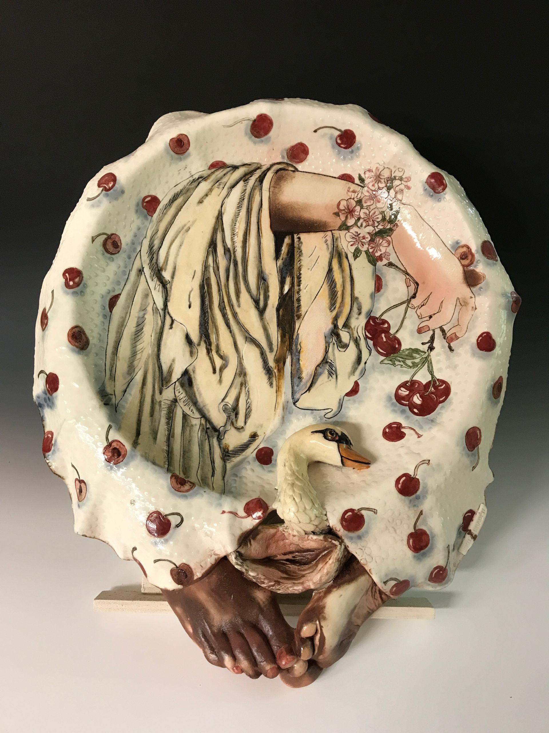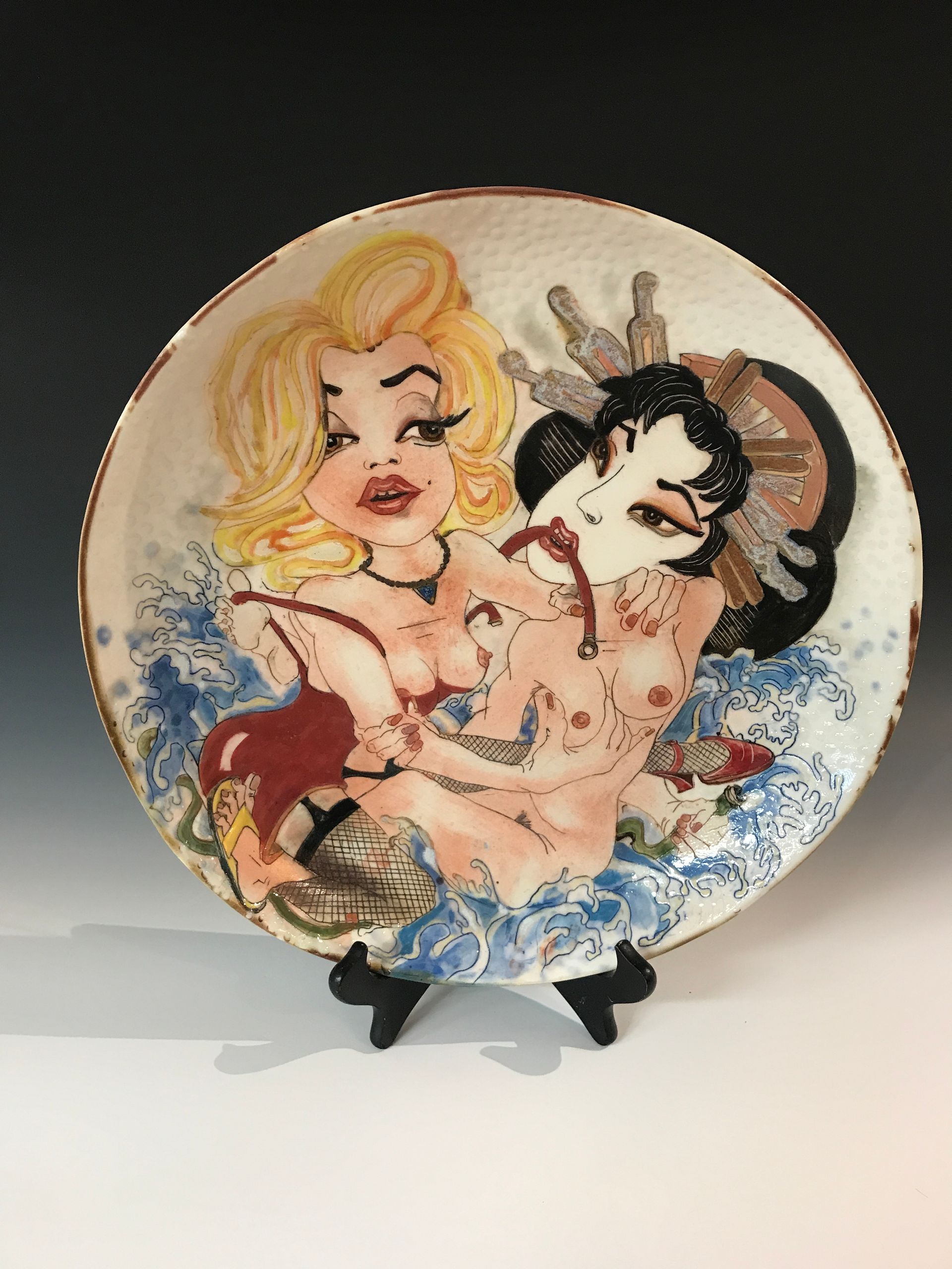 Skuja Braden’s art embodies a new way to experience and arrange ceramic—a vehicle for visual leaps of daring, experiments with and distortions of syntax, forming a new cosmos that contains everything we are and all we never dared to be. In reverence for pure love, they epically embrace both East and West, interweaving Marilyn Monroe and Geisha, angels and demons, diptych and triptych. Standing before their world, one becomes electric—mystified, euphoric, and human—transformed by unknown structures of power. You are the eyes that watch yourself. And you are the one being seen as if in a playful dream.