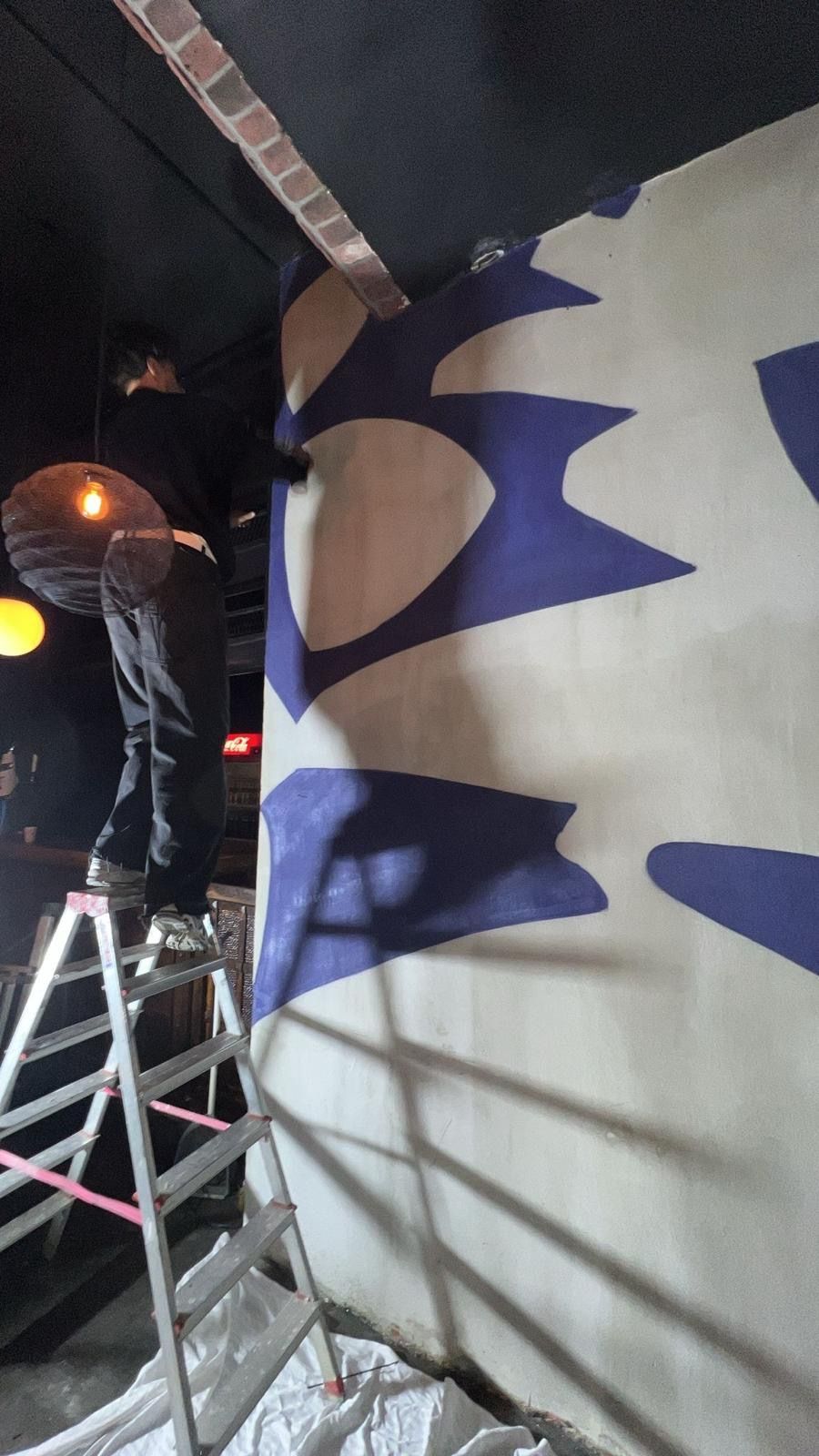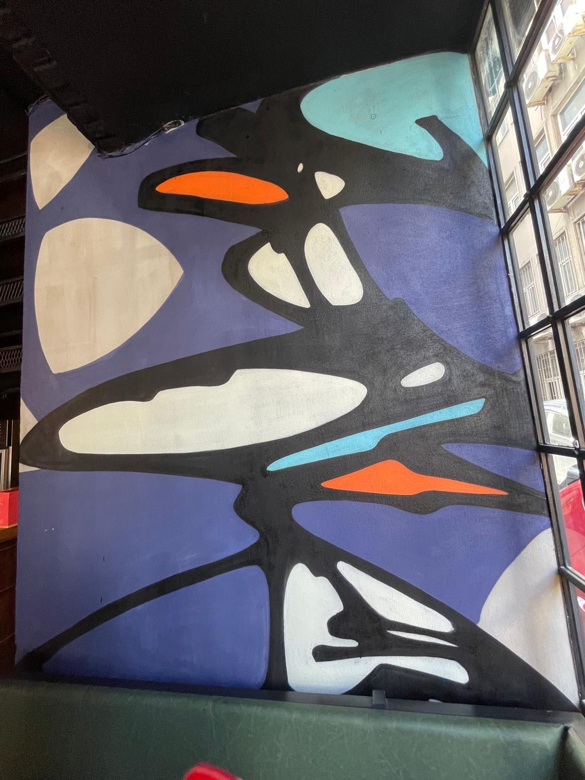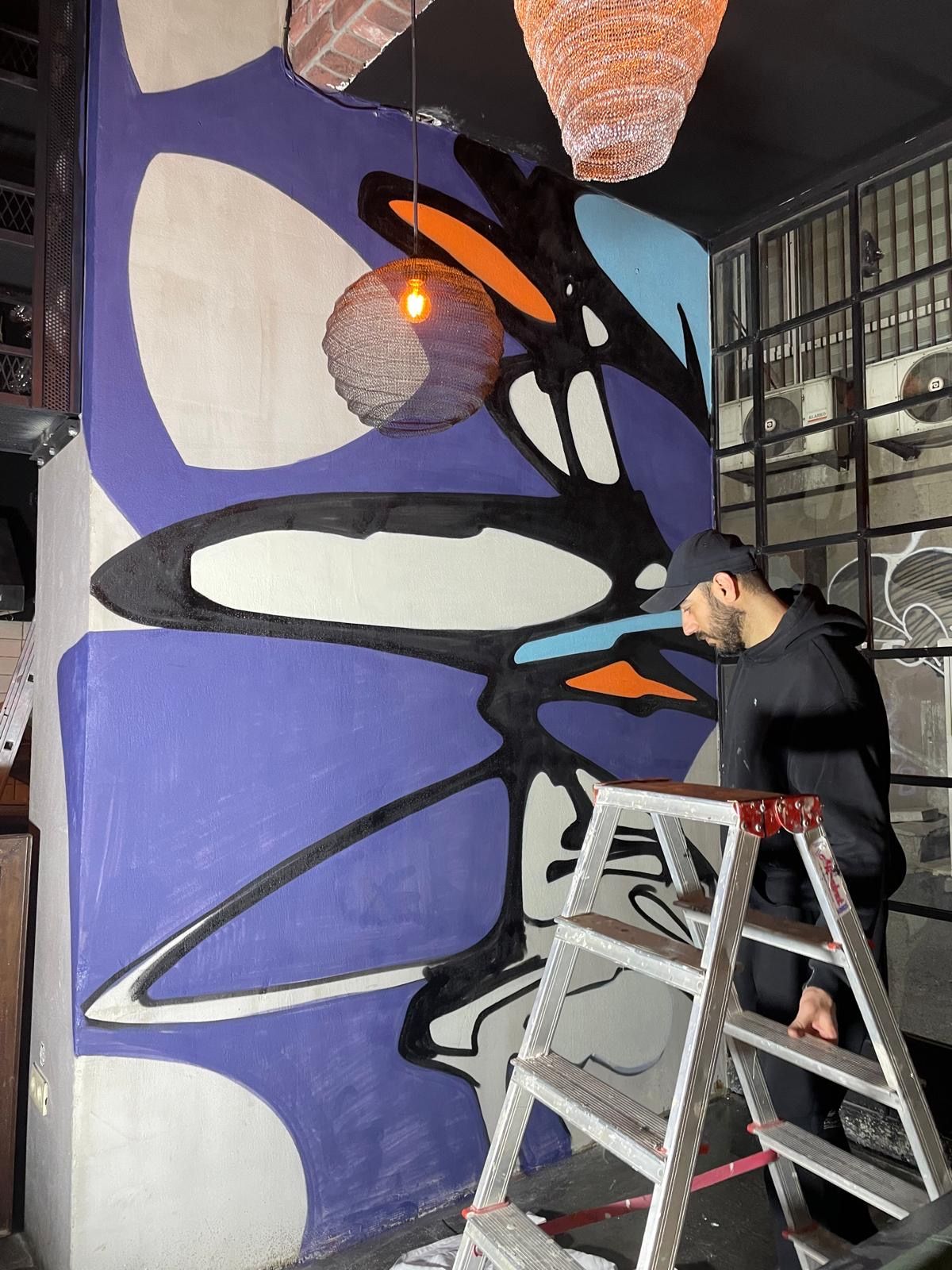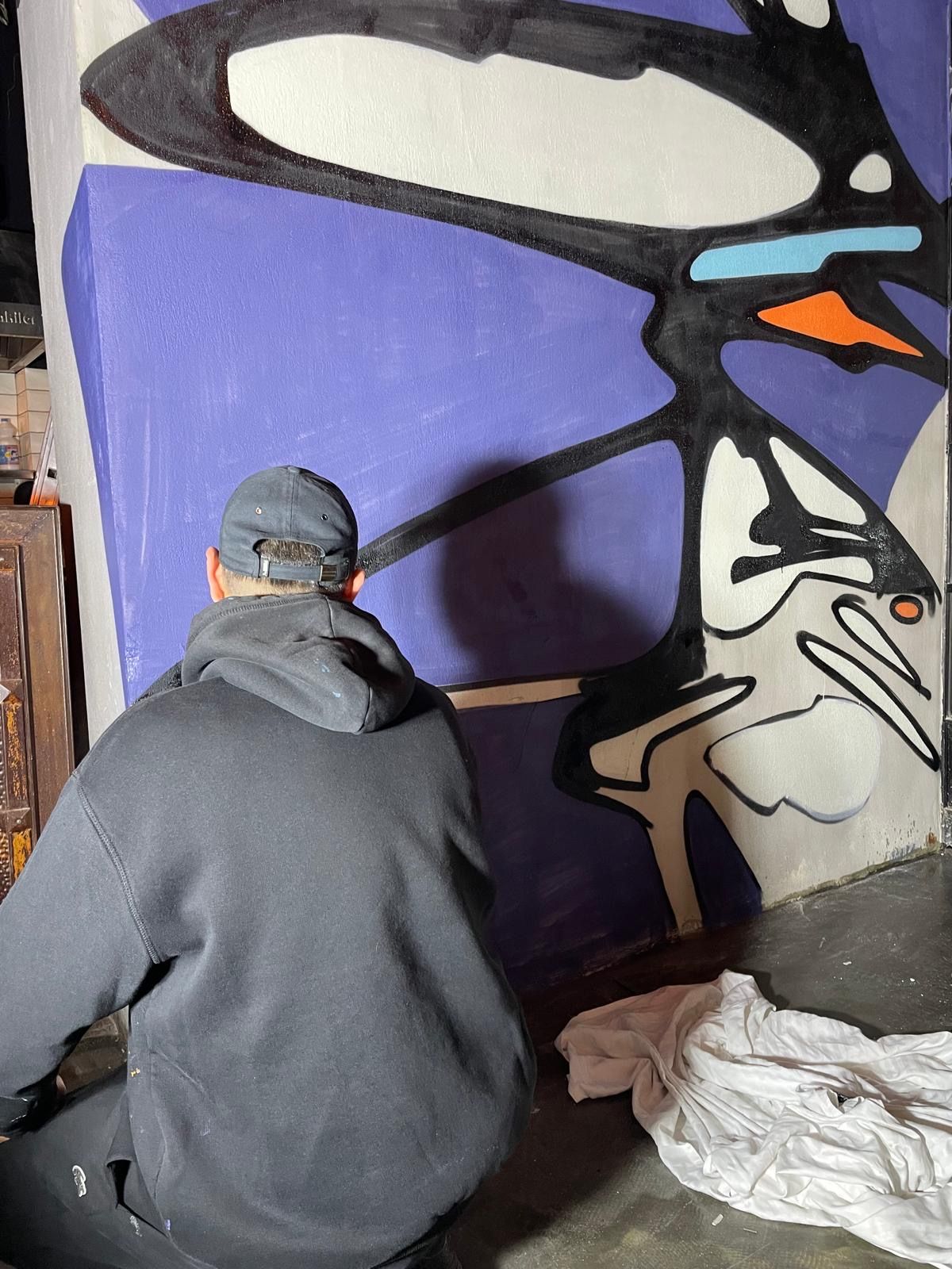 Rendered in neon and expressive brushwork, the crow draws on Edgar Allan Poe’s The Raven, evoking themes of memory, transformation, and watchfulness. During the painting process, a spontaneous visit from rapper Mikrop added a moment of unexpected magic—he played an unreleased track while Leo painted, turning the bar into a live intersection of music, poetry, and art. The crow doesn’t just look back—it radiates presence, acting as both beacon and echo.